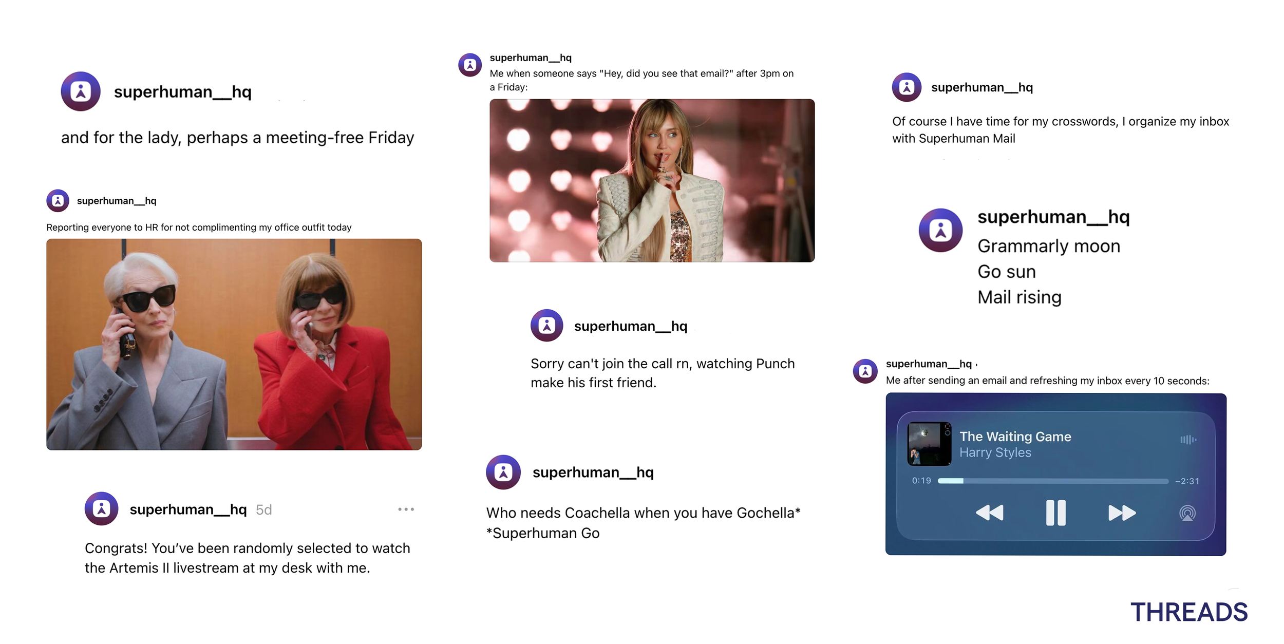 During my time with Born&Bred, Superhuman brought us in at the ground level — before their social presence existed. I helped build their channels from scratch across Instagram, LinkedIn, Threads, and X establishing the voice, creative approach, and content infrastructure that everything since has been built on.
