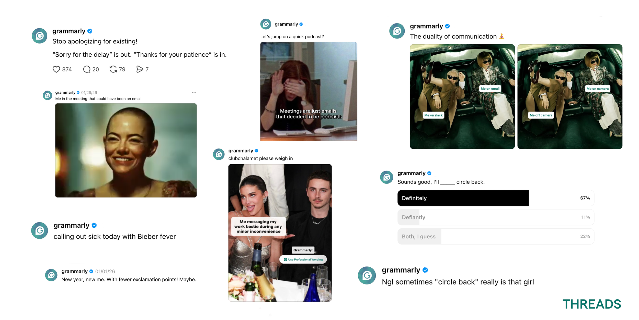 On the Grammarly side, the work follows a similar model — embedded, social-first, and spanning both content and creator partnerships. Multiple viral posts across organic brand content and creator-driven work, with a particular focus on vetting and building out Substack newsletter partnerships that are strategic fits, not just big numbers.